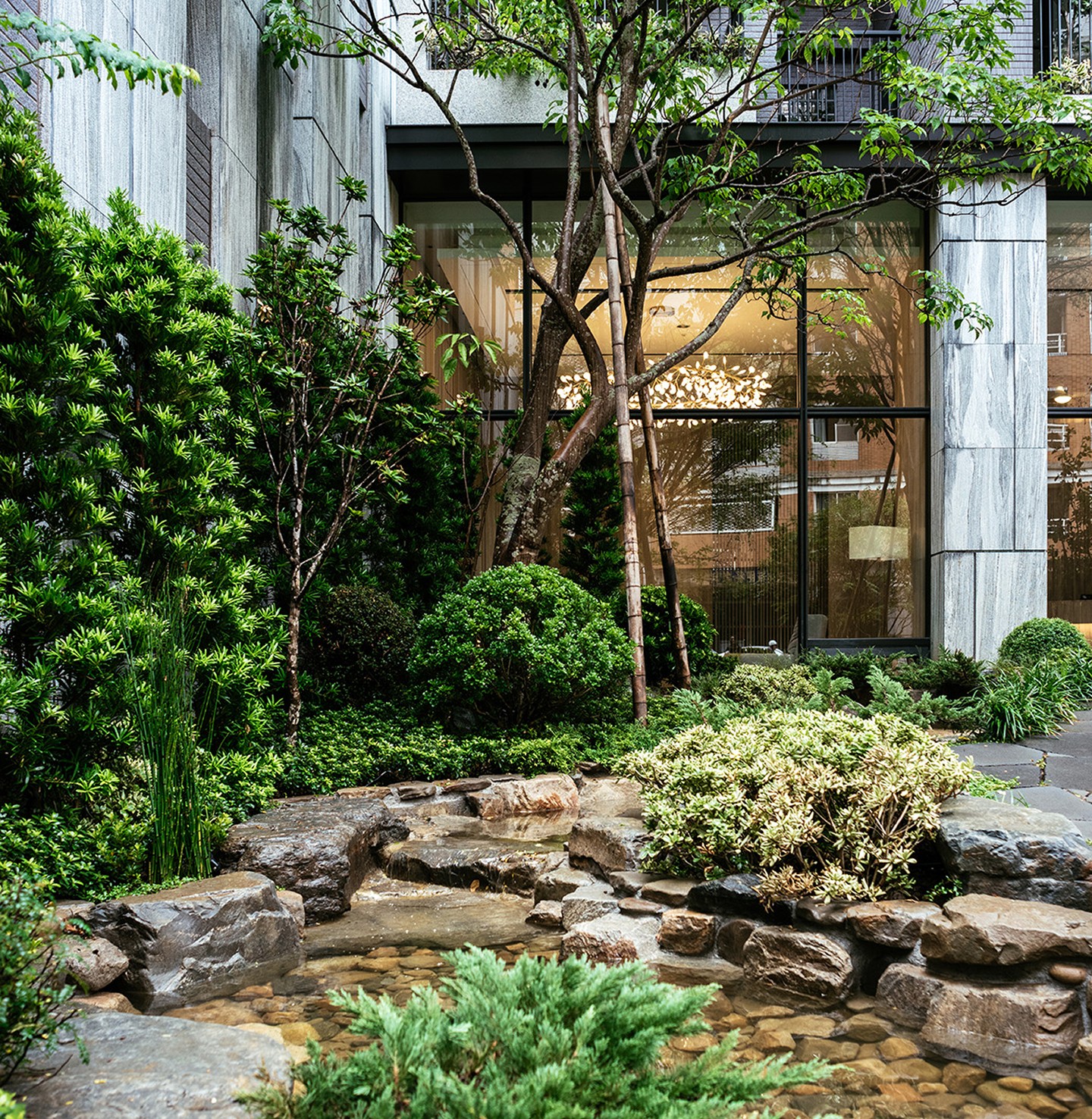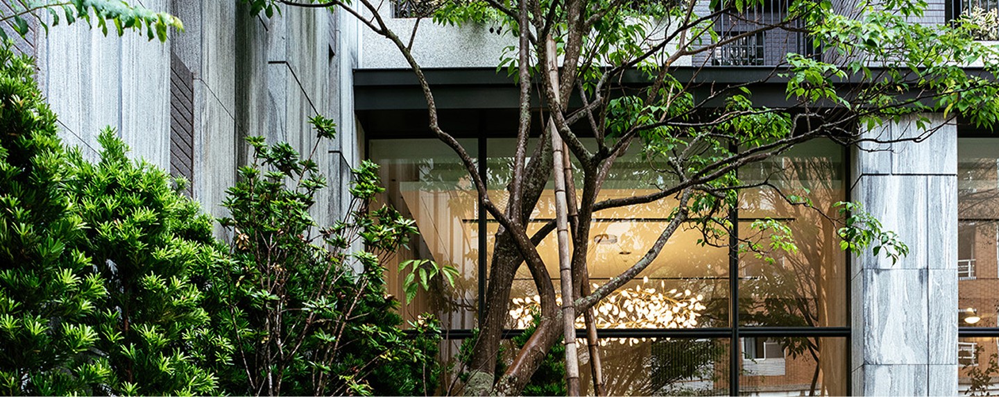 期望在傳統園林與自然山林遊園體驗取得平衡。打破規則動線。以公共藝術結合景觀石牆的迎賓入口作為第一印象。再將層層細緻山水映入眼簾,轉折入大廳。建築佈局對應多方位的綠覆,各時各節皆有風景。