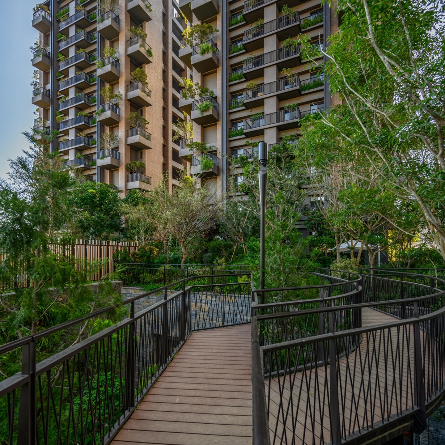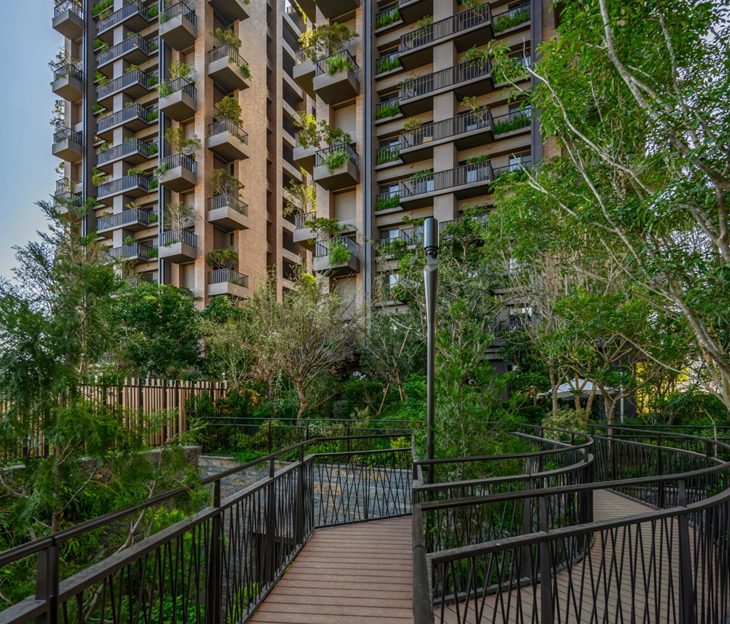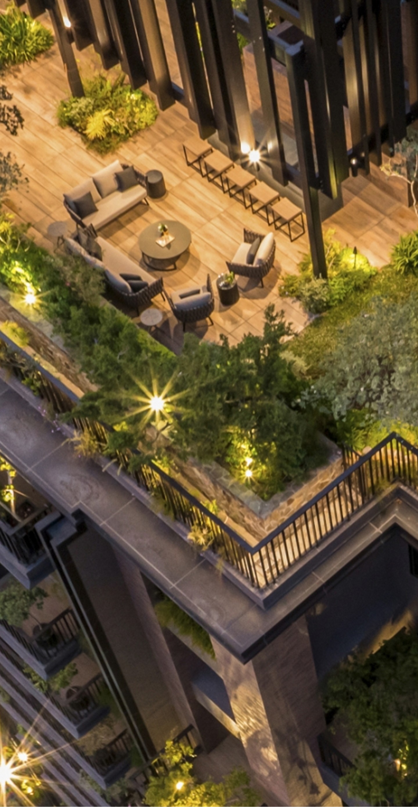 錯落有致的宜居陽台,生動綠意拾級而上。延伸至樓頂觀松平台,入茶屋窗景。淡雅閒情,悠遊自得。