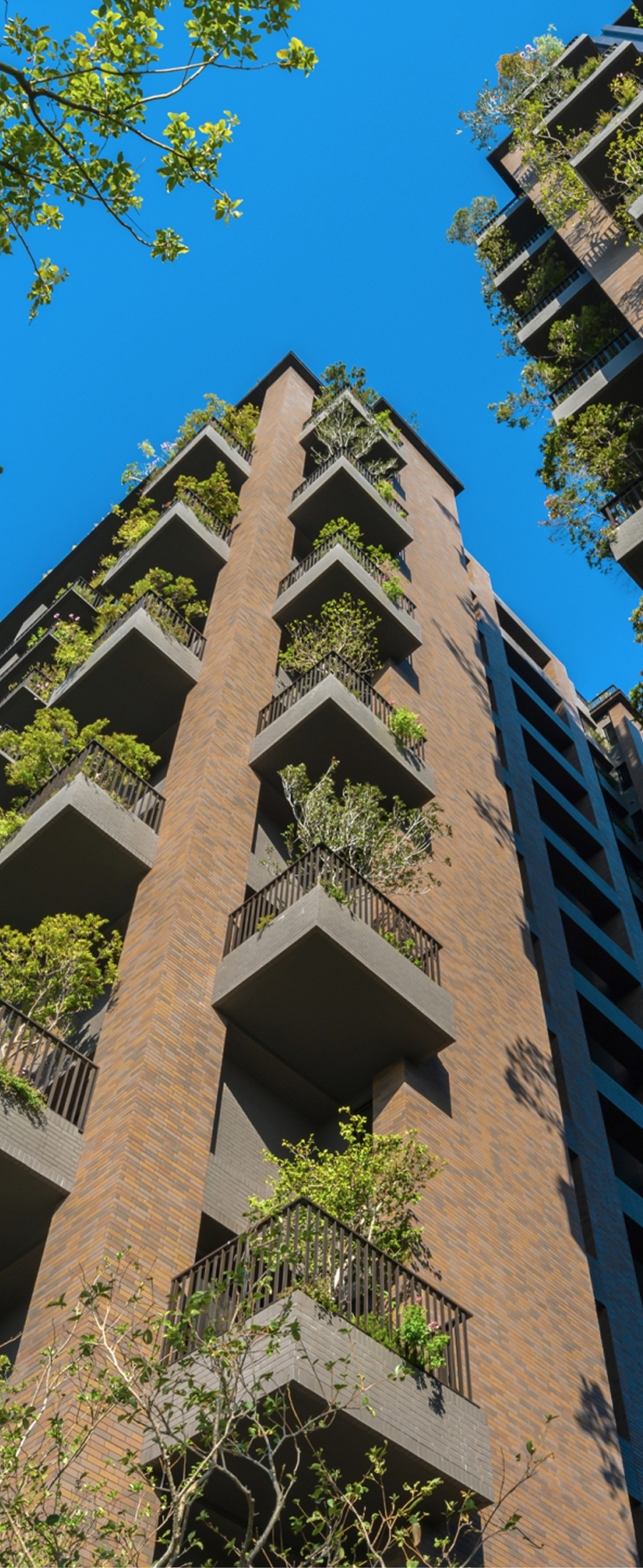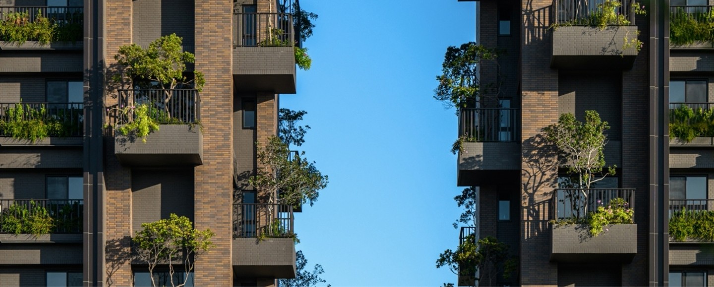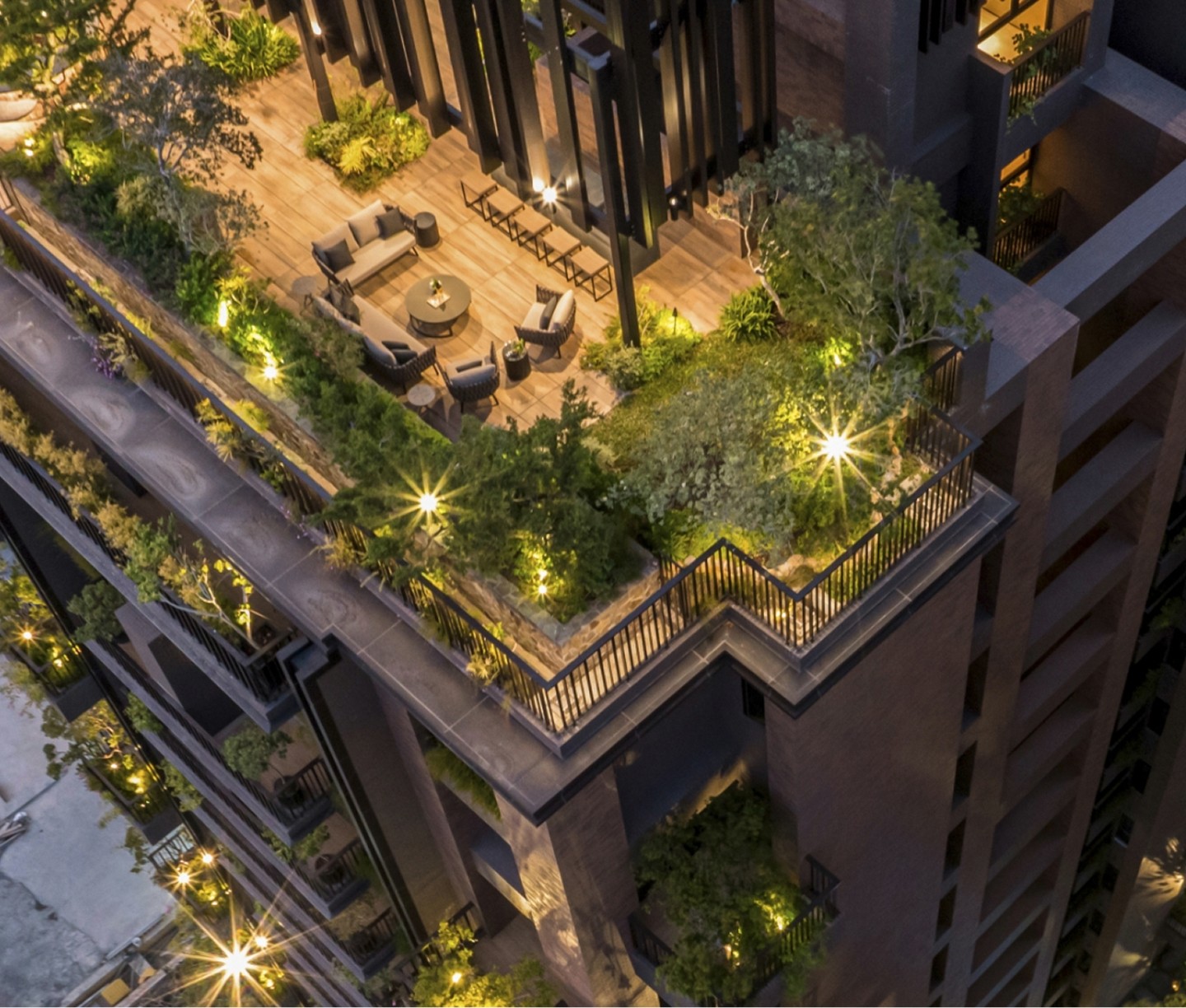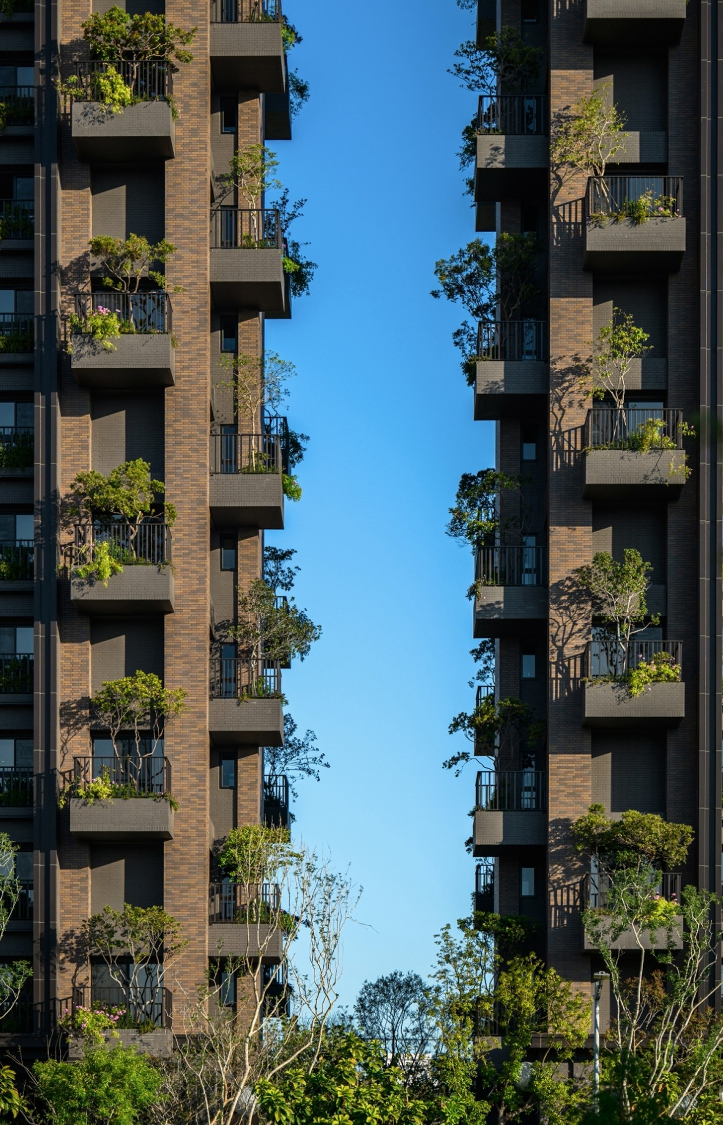 錯落有致的宜居陽台,生動綠意拾級而上。延伸至樓頂觀松平台,入茶屋窗景。淡雅閒情,悠遊自得。
